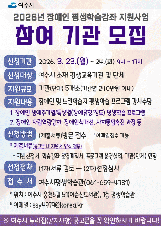 [¹Ìµð¾îÀü³² ÀüÇü¼º ±âÀÚ]¿©¼ö½Ã´Â Áö¿ª ³» Àå¾ÖÀÎÀÇ Æò»ýÇнÀ±Ç º¸Àå°ú ÀÚ¸³»ýȰ ´É·Â °È¸¦ À§ÇØ '2026³â Àå¾ÖÀÎ Æò»ýÇнÀ°Á Áö¿ø»ç¾÷'¿¡ Âü¿©ÇÒ ±â°ü¡¤´Üü¸¦ ¸ðÁýÇÑ´Ù. À̹ø »ç¾÷Àº Àå¾ÖÀΰú ´À¸°ÇнÀÀÚ¸¦ ´ë»óÀ¸·Î Æò»ýÇнÀ ÇÁ·Î¡¦