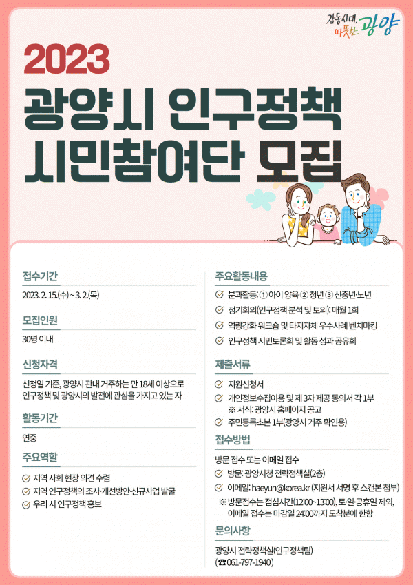 [¹Ìµð¾îÀü³² ÀÓ¼º¿Ï ±âÀÚ] ±¤¾ç½Ã´Â ÀúÃâ»ý¡¤°í·ÉÈ, û³âÀα¸ À¯Ãâ µî Àα¸±¸Á¶ º¯È ´ëÀÀ ¹æ¾ÈÀ» ¸ð»öÇÏ°í ¼ö¿ä¸ÂÃãÇü Àα¸Á¤Ã¥À» ¹ß±¼Çϱâ À§ÇØ 2023³â ¡®±¤¾ç½Ã Àα¸Á¤Ã¥ ½Ã¹ÎÂü¿©´Ü¡¯À» ¸ðÁýÇÑ´Ù. ¡®±¤¾ç½Ã Àα¸Á¤Ã¥ ½Ã¹ÎÂü¿©´Ü¡¯Àº¡¦
