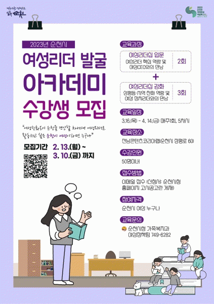 [¹Ìµð¾îÀü³² ÀÓ¼º¿Ï ±âÀÚ] ¼øÃµ½Ã´Â ¿©¼ºÄ£Èµµ½Ã ¼øÃµÀ» °ßÀÎÇÒ Â÷¼¼´ë ¿©¼º¸®´õ ¹ß±¼ ¾ÆÄ«µ¥¹Ì ±³À° ¼ö°»ýÀ» ¿À´Â 13ÀϺÎÅÍ ´ÙÀ½ ´Þ 10ÀϱîÁö ¸ðÁýÇÑ´Ù°í ¹àÇû´Ù. À̹ø ¾ÆÄ«µ¥¹Ì´Â ¿©¼ºÀÇ »çȸ, °æÁ¦Âü¿© È®´ë¸¦ À§ÇÑ ¿©¼º¸®´õ½ÊÀ» °¡¦