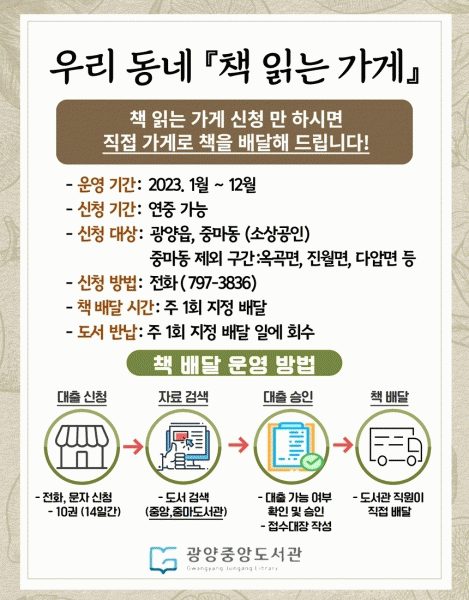 [¹Ìµð¾îÀü³² ÀÓ¼º¿Ï ±âÀÚ] ±¤¾ç½Ã¸³µµ¼°üÀÌ Áö¿ª»çȸ µ¶¼¹®È È®»êÀ» À§ÇØ µµ¼°ü ¹æ¹®ÀÌ ¾î·Á¿î Áö¿ª ³» ¼Ò»ó°øÀÎÀ» À§ÇÑ Ã¥ ¹è´Þ ¼ºñ½º¡®Ã¥ Àд °¡°Ô¡¯¸¦ ¿î¿µÇÑ´Ù. ¡®Ã¥ Àд °¡°Ô¡¯´Â 2ÀÎ ÀÌÇÏ ¼Ò±Ô¸ð °¡°ÔÀÇ ¿î¿µÀÚ¿Í °¡°Ô¸¦ 㡦