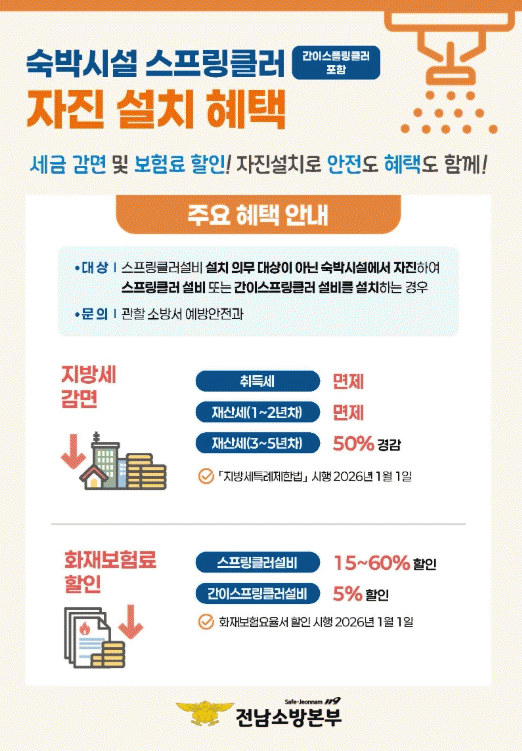 [¹Ìµð¾îÀü³² Á¦°¥´ëÁ¾ ±âÀÚ]Àü¶ó³²µµ¼Ò¹æº»ºÎ´Â 2026³â 1¿ù 1ÀϺÎÅÍ ¼÷¹Ú½Ã¼³ÀÌ ÀÚ¹ßÀûÀ¸·Î ½ºÇÁ¸µÅ¬·¯ µî ¼Ò¹æ½Ã¼³À» ¼³Ä¡ÇÒ °æ¿ì Áö¹æ¼¼ °¨¸é°ú ÈÀ纸Çè·á ÇÒÀÎ ÇýÅÃÀ» Á¦°øÇÑ´Ù°í ¹àÇû´Ù. À̹ø Á¦µµ´Â ¹ýÀû ¼³Ä¡ Àǹ«°¡ ¾ø´Â ³ëÈÄ ¼÷¡¦
