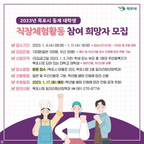 [¹Ìµð¾îÀü³² °í±Ô¼® ±âÀÚ] ¸ñÆ÷½Ã°¡ ´ëÇб³ °Ü¿ï¹æÇÐ ±â°£ÀÎ 1¿ù 25ÀϺÎÅÍ 2¿ù 21ÀϱîÁö ´ëÇлý Á÷ÀåüÇèȰµ¿ Áö¿ø»ç¾÷À» ¿î¿µÇÑ´Ù. ½Ã´Â Àη¼ö±ÞÀÇ ¾î·Á¿òÀ» °Þ°í ÀÖ´Â ±â¾÷¡¤±â°üÀ» Áö¿øÇϱâ À§ÇØ ¿ÃÇØ ¸ðÁýÀοøÀ» 130¸íÀ¸·Î ´ëÆø È®¡¦