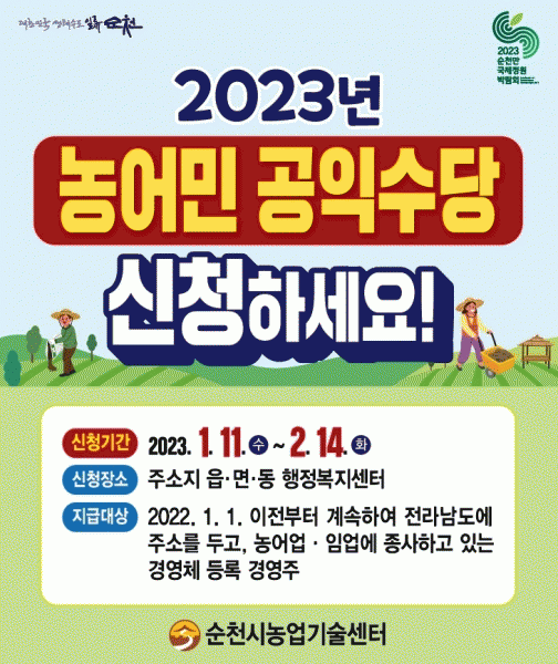 [¹Ìµð¾îÀü³² ÀÓ¼º¿Ï ±âÀÚ] ¼øÃµ½Ã´Â ¿À´Â 11ÀϺÎÅÍ ´ÙÀ½´Þ 14ÀϱîÁö ¡®2023³â ³ó¾î¹Î °øÀͼö´ç¡¯½ÅûÀ» ÁÖ¼ÒÁö °üÇÒ À¾¸éµ¿ ÇàÁ¤º¹Áö¼¾ÅÍ¿¡¼ Á¢¼öÇÑ´Ù°í 5ÀÏ ¹àÇû´Ù. ¡®³ó¾î¹Î °øÀͼö´ç¡¯Àº ³ó¾î¹Î¡¤ÀÓ¾÷ÀÎÀÇ »îÀÇ Áú Çâ»ó°ú ³ó¾î¾÷¡¤³ó¡¦