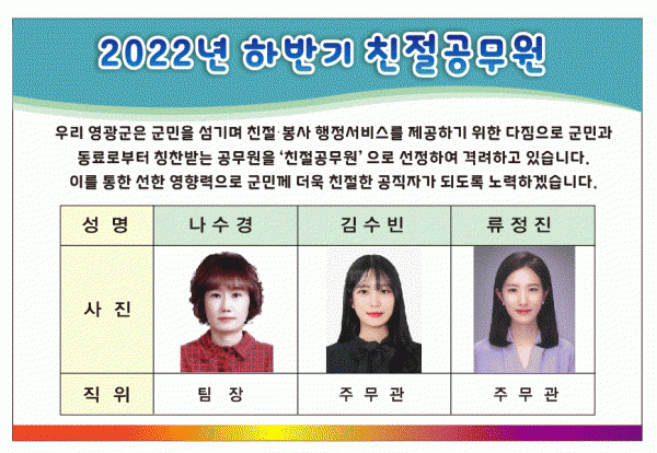 [¹Ìµð¾îÀü³² Á¦°¥´ëÁ¾ ±âÀÚ] ¿µ±¤±ºÀº Ä£ÀýÇÏ°í ½Å¼ÓÇÑ ¾÷¹«Ã³¸®·Î ±º¹ÎÀÇ ÇàÁ¤¼ºñ½º ¸¸Á·µµ¸¦ ³ôÀ̰í Ä£ÀýºÐÀ§±â È®»êÀ» À§ÇØ 2022³â ÇϹݱâ Ä£Àý°ø¹«¿øÀ» ¼±¹ßÇß´Ù. À̹ø¿¡ ¼±Á¤µÈ Ä£Àý°ø¹«¿ø 3¸íÀº ¿µ±¤À¾ ³ª¼ö°æ ¹Î¿øÆÀÀå, È«³óÀ¾ ¡¦