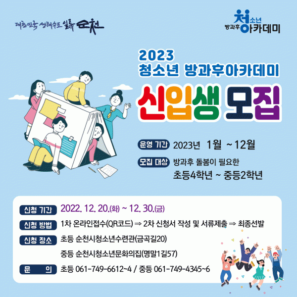 [¹Ìµð¾îÀü³² ÀÓ¼º¿Ï ±âÀÚ] ¼øÃµ½Ã´Â ¿À´Â 20ÀϺÎÅÍ 2023³âµµ û¼Ò³â¹æ°úÈľÆÄ«µ¥¹Ì ½ÅÀÔ»ýÀ» ¸ðÁýÇÑ´Ù. ¸ðÁý´ë»ó°ú ÀοøÀº °ü³» ¹æ°ú ÈÄ µ¹º½ÀÌ ÇÊ¿äÇÑ ÃʵîÇб³ 4~6Çгâ 40¸í, ÁßÇб³ 1~2Çгâ 40¸íÀÌ´Ù. ¿À´Â 20ÀϺÎÅÍ 30ÀϱîÁö QRÄÚ¡¦