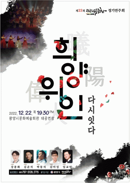 [¹Ìµð¾îÀü³² ÀÓ¼º¿Ï ±âÀÚ] ±¤¾ç½Ã¸³±¹¾Ç´ÜÀº ¿À´Â 22ÀÏ Àú³á 7½Ã 30ºÐ ±¤¾ç¹®È¿¹¼úȸ°ü ´ë°ø¿¬Àå¿¡¼ ¡®Èñ¾çÀ§ÀÎ. ´Ù½Ã ÀÕ´Ù¡¯¸¦ ÁÖÁ¦·Î Á¦23ȸ Á¤±â °ø¿¬À» °³ÃÖÇÑ´Ù. À̹ø °ø¿¬Àº ±¤¾çÀÇ Àι°À» À½¾ÇÀ¸·Î Ç¥ÇöÇØ »õ·Ó°Ô Á¶¸íÇϰí Àι°¡¦