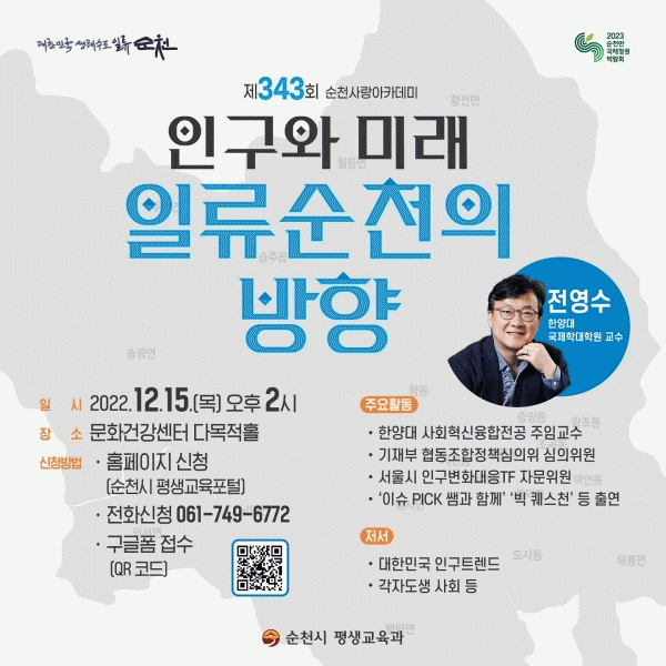 [¹Ìµð¾îÀü³² ÀÓ¼º¿Ï ±âÀÚ] ¼øÃµ½Ã´Â ¿À´Â 15ÀÏ ¿ÀÈÄ 2½Ã ¼øÃµ½Ã ¹®È°Ç°¼¾ÅÍ ´Ù¸ñÀûȦ¿¡¼ ¡®Àα¸¿Í ¹Ì·¡, ÀÏ·ù¼øÃµÀÇ ¹æÇ⡯À̶ó´Â ÁÖÁ¦·Î ¿ÃÇØ ¸¶Áö¸· Á¦343ȸ ¼øÃµ»ç¶û¾ÆÄ«µ¥¹Ì¸¦ °³ÃÖÇÑ´Ù. À̹ø °¿¬Àº ÀúÃâ»ê, °í·ÉÈ¿¡ µû¸¥ Àα¸¡¦