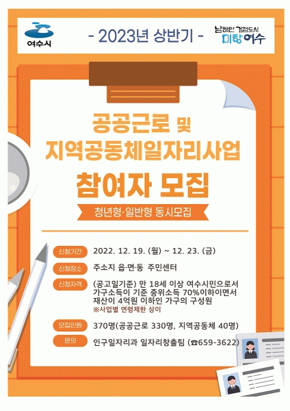 [¹Ìµð¾îÀü³² ÀüÇü¼º ±âÀÚ] ¿©¼ö½Ã°¡ ¡®2023³â »ó¹Ý±â °ø°øÀÏÀÚ¸®»ç¾÷¡¯ Âü¿©ÀÚ¸¦ ¸ðÁýÇÑ´Ù. ¸ðÁý ÀοøÀº °ø°ø±Ù·Î»ç¾÷ 330¸í, Áö¿ª°øµ¿Ã¼ ÀÏÀÚ¸®»ç¾÷ 40¸íÀ¸·Î ÃÑ 370¸íÀÌ´Ù. ½Åû ´ë»óÀº ¿©¼ö½Ã¿¡ °ÅÁÖÇÏ´Â ¸¸ 18¼¼ ÀÌ»ó ±Ù·Î´É·ÂÀڷΡ¦