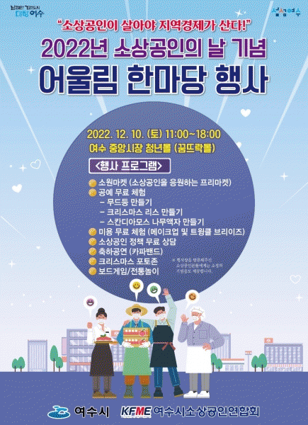 [¹Ìµð¾îÀü³² ÀüÇü¼º ±âÀÚ] ¿©¼ö½Ã¿Í ¿©¼ö½Ã¼Ò»ó°øÀο¬ÇÕȸ°¡ ¿À´Â 10ÀÏ ¿©¼ö Áß¾Ó½ÃÀå ²Þ¶ß¶ô¸ô¿¡¼ ¡®2022³â ¼Ò»ó°øÀÎÀÇ ³¯ ±â³ä ¾î¿ï¸² ÇѸ¶´ç Çà»ç¡¯¸¦ °³ÃÖÇÑ´Ù. ¡®¼Ò»ó°øÀÎÀÇ ³¯¡¯Àº ¸Å³â 11¿ù 5ÀÏ·Î ¼Ò»ó°øÀÎÀÇ »çȸÀû ÁöÀ§ Çâ»ó ¡¦