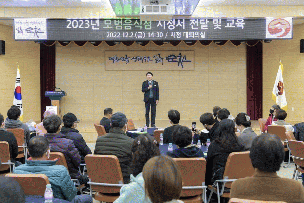 [¹Ìµð¾îÀü³² ÀÓ¼º¿Ï ±âÀÚ] ¼øÃµ½Ã´Â Áö³ 2ÀÏ ½Ãû ´ëȸÀǽǿ¡¼ ¡®2023³â ¼øÃµ½Ã ¸ð¹üÀ½½ÄÁ¡ ÁöÁ¤¼ Àü´Þ½Ä ¹× ¸¶ÀÎµå ±³À°¡¯À» °³ÃÖÇß´Ù. À̳¯ Àü´Þ½ÄÀº ¸ð¹üÀ½½ÄÁ¡ ¿µ¾÷ÁÖ, ¿Ü½Ä¾÷ÁöºÎ µî °ü°èÀÚ 140¿©¸íÀÌ Âü¼®ÇÑ °¡¿îµ¥ Ŭ·¡½Ä°ø¿¬¡¦