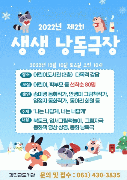 [¹Ìµð¾îÀü³² Á¦°¥´ëÁ¾ ±âÀÚ] °Áø±ºµµ¼°üÀÌ ¿À´Â 12¿ù 10ÀÏ ¾î¸°À̵µ¼°ü 2Ãþ ´Ù¸ñÀû °´ç¿¡¼ ¾î¸°ÀÌ¿Í ºÎ¸ð°¡ ÇÔ²² Áñ±â´Â¡®2022³â Á¦2ȸ »ý»ý ³¶µ¶±ØÀ塯À» °³ÃÖÇÑ´Ù. »ý»ý ³¶µ¶±ØÀåÀº ´Ù¾çÇÑ ÁÖÁ¦¸¦ °¡Áö°í »çȸÀÚ¿Í ³¶µ¶ÀÚ ±×¸®°í¡¦