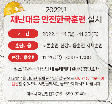 [¹Ìµð¾îÀü³² ÀüÇü¼º ±âÀÚ] ¿©¼ö½Ã°¡ 14ÀϺÎÅÍ 25ÀϱîÁö ¡®2022³â Àç³´ëÀÀ ¾ÈÀüÇѱ¹ÈƷá¯À» ½Ç½ÃÇÑ´Ù. À̹ø ÈÆ·ÃÀº ¿©¼ö±¹°¡»ê´Ü¿¡¼ ¹ß»ýÇÒ ¼ö ÀÖ´Â °í¾Ð¼³ºñ ÈÀç¡¤Æø¹ß »ç°í¸¦ °¡Á¤ÇØ À¯°ü±â°üº° À¯±âÀû ´ëÀÀ Çù·Âü°è ±¸ÃàÀ» ¸ñÇ¥·Î¡¦
