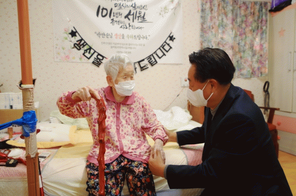 [¹Ìµð¾îÀü³² Á¦°¥´ëÁ¾ ±âÀÚ] °î¼º±ºÀÌ 100¼¼¸¦ ¸ÂÀÌÇÑ °í·É ÁֹΠ4¸í¿¡°Ô ´ëÅë·É ÃàÇÏ ¼ÇѰú ÇÔ²² û·ÁÀå°ú Àå¼ö ±â³ä ¼±¹°À» Àü´ÞÇß´Ù°í ¹àÇû´Ù. û·ÁÀåÀº ¸í¾ÆÁÖ¶ó´Â Ç®·Î ¸¸µç °¡º±°í ´Ü´ÜÇÑ ÁöÆÎÀÌ·Î °Ç°°ú Àå¼öÀÇ »ó¡À¸·Î ¿©°Ü¡¦
