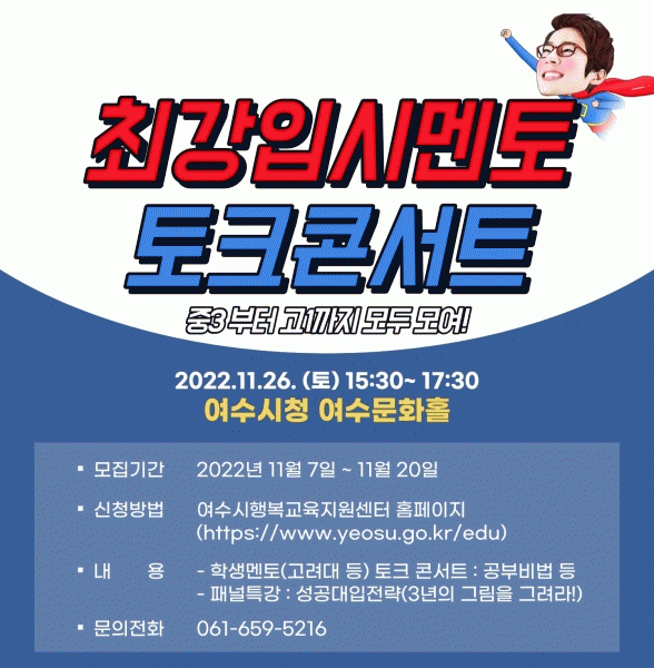[¹Ìµð¾îÀü³² ÀüÇü¼º ±âÀÚ] ¿©¼ö½Ã°¡ ¿À´Â 26ÀÏ Åä¿äÀÏ ¿©¼ö¹®ÈȦ¿¡¼ ¼º°øÀûÀÎ ´ëÀÔÀü·«À» À§ÇÑ ¡®ÃÖ° ÀԽøàÅä ÅäÅ© ÄܼƮ¡¯¸¦ °³ÃÖÇÑ´Ù. À̹ø ÅäÅ©ÄܼƮ¿¡´Â Áö¿ª Ãâ½Å ¸í¹®´ë ´ëÇлý ¸àÅä¿Í Àü¹® ÀÔ½ÃÆÐ³ÎÀÌ Ãâ¿¬ÇØ Áø·Î ¼³Á¤ÀÇ ¡¦