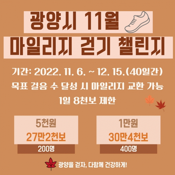 [¹Ìµð¾îÀü³² ÀÓ¼º¿Ï ±âÀÚ] ±¤¾ç½Ã°¡ °È±â¸¦ ÅëÇØ °Ç°ÇÑ Áö¿ª»çȸ ºÐÀ§±â¸¦ Á¶¼ºÇϰíÀÚ ÀÏ»ó ¼Ó °Ç°°È±â ½Çõ ¸ð¹ÙÀÏ °È±â ¾Û ¿öÅ©¿Â ¡®11¿ù ¿öÅ©¿Â °È±â 縰Áö¡¯¸¦ ¿î¿µÇÑ´Ù. 11¿ù 6ÀÏ~12¿ù 15ÀÏ ÁøÇàµÇ´Â °È±â 縰Áö´Â 1°ÉÀ½´ç 1¸¶¡¦