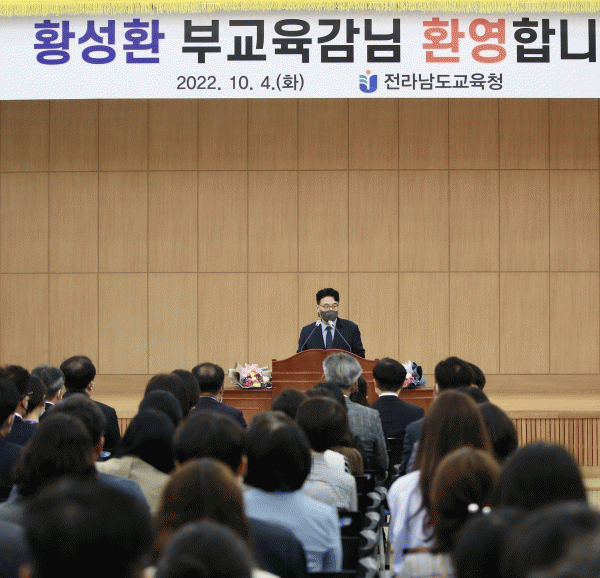 [¹Ìµð¾îÀü³² Á¦°¥´ëÁ¾ ±âÀÚ] Ȳ¼ºÈ¯ Àü¶ó³²µµºÎ±³À°°¨ÀÌ 10¿ù 4ÀÏ ¿ÀÀü Àü³²±³À°Ã» 2Ãþ ´ëȸÀǽǿ¡¼ ±è´ëÁß ±³À°°¨À» ºñ·ÔÇÑ °£ºÎµé°ú Á÷¿øµéÀÌ Âü¼®ÇÑ °¡¿îµ¥ ºÎÀÓ½ÄÀ» °®°í °ø½Ä ¾÷¹«¸¦ ½ÃÀÛÇß´Ù. Ȳ¼ºÈ¯ ºÎ±³À°°¨Àº ºÎ»ê±¤¿ª½Ã Ãâ½Å¡¦