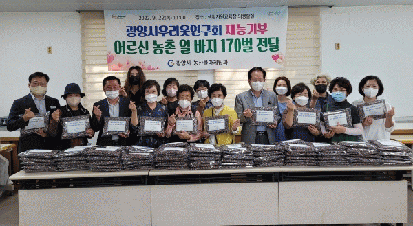 [¹Ìµð¾îÀü³² ÀÓ¼º¿Ï ±âÀÚ] ±¤¾ç½Ã ¿ì¸®¿Ê¿¬±¸È¸´Â Àç´É±âºÎ·Î Á¦ÀÛÇÑ ³óÀÛ¾÷¿ë ÀϹÙÁö 170¹úÀ» Áö³ 22ÀÏ ¸¶À»³ëÀÎȸ¿Í ³óÃÌÁö¿ª ¾î¸£½Åµé¿¡°Ô Àü´ÞÇØ »ç¶û ³ª´®À» ½ÇõÇß´Ù. ¿ì¸®¿Ê¿¬±¸È¸´Â ±¤¾ç½Ã³ó¾÷±â¼ú¼¾ÅÍ ³óÃÌÀÚ¿ø¿¬±¸ °úÁ¦±³À°¿¡¡¦