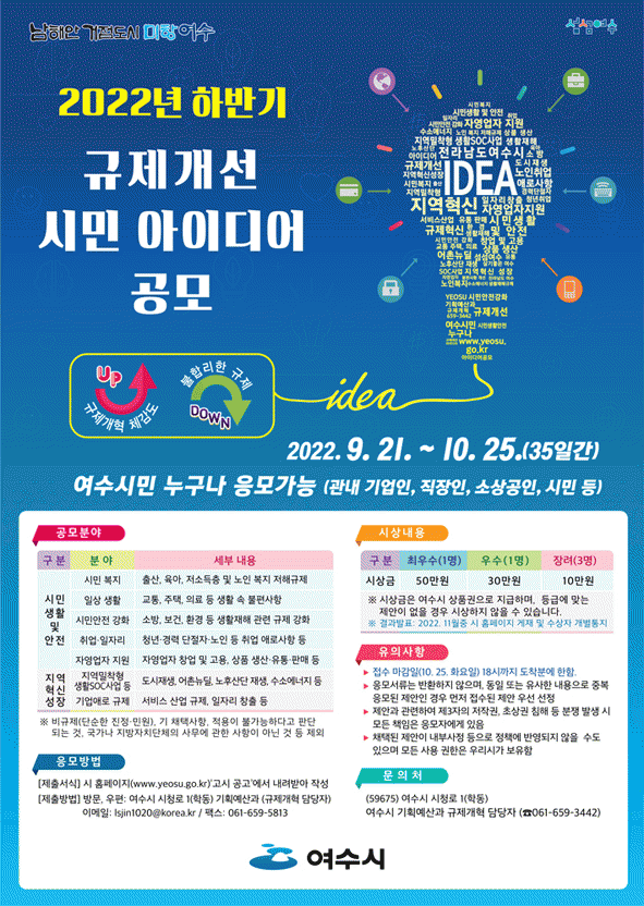 [¹Ìµð¾îÀü³² ÀüÇü¼º ±âÀÚ] ¿©¼ö½Ã°¡ ½Ã¹Î »ýȰ°ú ±â¾÷ Ȱµ¿À» ÀúÇØÇÏ´Â ºÒÇÕ¸®ÇÑ ±ÔÁ¦¸¦ °³¼±Çϱâ À§ÇØ ¡®2022³â ÇϹݱ⠱ÔÁ¦°³¼± ½Ã¹Î ¾ÆÀ̵ð¾î¡¯¸¦ °ø¸ðÇÑ´Ù. °ø¸ð ºÐ¾ß´Â ½Ã¹Î»ýȰ ¹× ¾ÈÀü Áö¿ª Çõ½Å¼ºÀå 2°³ ºÐ¾ß·Î ¿©¼ö½Ã¹Î ´©±¸³ª¡¦