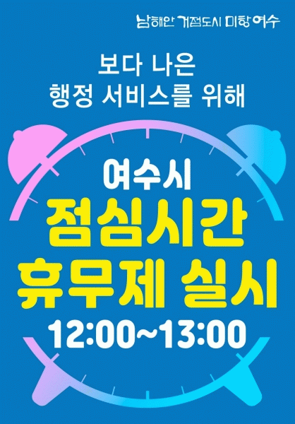 [¹Ìµð¾îÀü³² ÀüÇü¼º ±âÀÚ] ¿©¼ö½Ã°¡ °øÁ÷ÀÚÀÇ Á¡½É½Ã°£À» º¸ÀåÇØ ¾÷¹« È¿À²À» ³ôÀÌ°í º¸´Ù ³ªÀº ¹Î¿ø ÇàÁ¤¼ºñ½º¸¦ Á¦°øÇϱâ À§ÇØ ¡®Á¡½É½Ã°£ ÈÞ¹«Á¦¡¯¸¦ ½ÃÇàÇÑ´Ù. Á¡½É½Ã°£ ÈÞ¹«Á¦´Â Àα٠¼øÃµ½Ã¿Í ±¤¾ç½Ã»Ó¸¸ ¾Æ´Ï¶ó Àü¶ó³²µµ 13°³ Áö¡¦