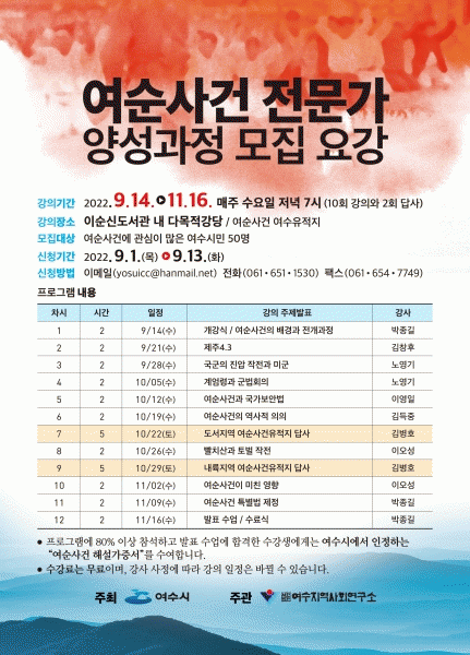 [¹Ìµð¾îÀü³² ÀüÇü¼º ±âÀÚ] ¿©¼ö½Ã°¡ ¿©¼öÁö¿ª»çȸ¿¬±¸¼Ò¿Í °øµ¿À¸·Î ¡®¿©¼ø»ç°Ç Àü¹®°¡ ¾ç¼º°úÁ¤ ÇÁ·Î±×·¥¡¯À» ¿î¿µÇÑ´Ù. 9¿ù 14ÀϺÎÅÍ 11¿ù 16ÀϱîÁö ¸ÅÁÖ ¼ö¿äÀÏ Àú³á 7½Ã¿¡ À̼ø½Åµµ¼°ü ´Ù¸ñÀû°´ç¿¡¼ ÁøÇàµÇ¸ç ±â ¸ðÁýÇÑ 55¸íÀÇ ¡¦
