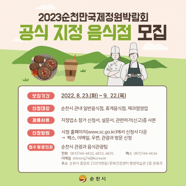 [¹Ìµð¾îÀü³² ÀÓ¼º¿Ï ±âÀÚ] ¼øÃµ½Ã´Â Á¤¿ø¹Ú¶÷ȸ ¼º°ø °³ÃÖ¸¦ À§ÇØ ¿ì¸® Áö¿ªÀ» ¹æ¹®ÇÏ´Â °ü±¤°´¿¡°Ô À½½Ä¿¡ ´ëÇÑ ½Å·Ú¿Í ¸¸Á·µµ¸¦ ³ôÀ̵µ·Ï ¡®2023¼øÃµ¸¸±¹Á¦Á¤¿ø¹Ú¶÷ȸ °ø½Ä ÁöÁ¤ À½½ÄÁ¡¡¯ 260°³¼Ò¸¦ ¼±Á¤ÇÑ´Ù°í 7ÀÏ ¹àÇû´Ù. Áö³ 6¿ù¿¡¡¦