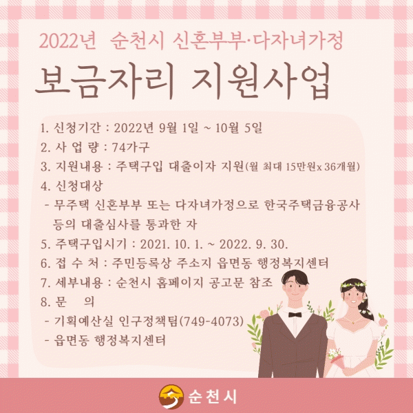 [¹Ìµð¾îÀü³² ÀÓ¼º¿Ï ±âÀÚ] ¼øÃµ½Ã´Â 9¿ù 1ÀϺÎÅÍ ¼øÃµ¿¡¼ÀÇ ¾ÈÁ¤ÀûÀÎ Á¤ÂøÀ» À§ÇØ ÁÖÅñ¸ÀÔ ´ëÃâÀÌÀÚ¸¦ Áö¿øÇØ ÁÖ´Â ¡®2022³â ½ÅÈ¥ºÎºÎ¡¤´ÙÀڳడÁ¤ º¸±ÝÀÚ¸® Áö¿ø»ç¾÷¡¯ÀÇ ´ë»óÀÚ¸¦ ¸ðÁýÇÑ´Ù. ½Åû ÀÚ°ÝÀº ¼øÃµ½Ã ¼ÒÀç ÁÖÅÃÀ» ±¸ÀÔÇÑ ¡¦