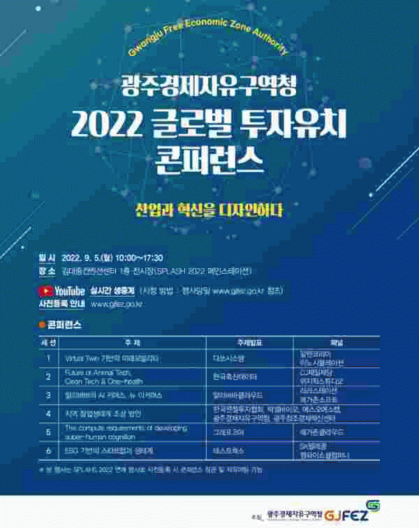 [¹Ìµð¾îÀü³² Á¦°¥´ëÁ¾ ±âÀÚ] ±¤ÁÖ°æÁ¦ÀÚÀ¯±¸¿ªÃ»Àº 9¿ù5ÀϺÎÅÍ ÀÌÆ²°£ ±è´ëÁßÄÁº¥¼Ç¼¾ÅÍ¿¡¼ ÷´Ü±â¾÷ ÅõÀÚÀ¯Ä¡¿Í ÀáÀçÅõÀÚÀڹ߱¼ ¹× ³×Æ®¿öÅ© È®´ë¸¦ À§ÇÑ ±¹Á¦Çà»ç·Î ¡®2022 ±Û·Î¹ú ÅõÀÚÀ¯Ä¡ ÄÜÆÛ·±½º¡¯¸¦ °³ÃÖÇÑ´Ù. À̹ø Çà»ç´Â ±¤ÁÖ¡¦