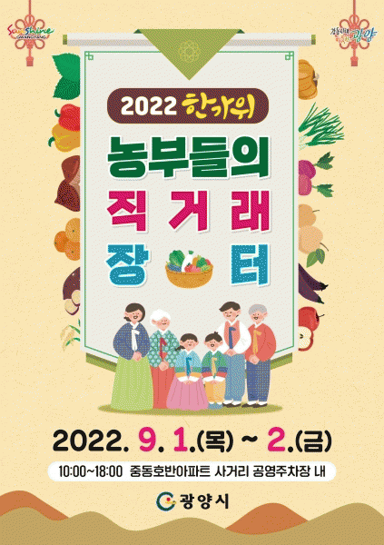 [¹Ìµð¾îÀü³² ÀÓ¼º¿Ï ±âÀÚ] ±¤¾ç½Ã´Â 2022³â Ãß¼® ¸íÀýÀ» ¸Â¾Æ 9¿ù 1ÀϺÎÅÍ ÀÌÆ²°£ ±¤¾ç½Ã¿¡¼ »ý»êµÇ´Â ¿ì¼ö ³óƯ»ê¹°À» Á÷°Å·¡·Î ±¸ÀÔÇÒ ¼ö ÀÖ´Â ¡®ÇѰ¡À§ ¸ÂÀÌ ³óºÎµéÀÇ Á÷°Å·¡ÀåÅÍ¡¯¸¦ ¿î¿µÇÑ´Ù. ÇѰ¡À§ ¸ÂÀÌ Á÷°Å·¡ÀåÅÍ´Â Áßµ¿ È£¹Ý¡¦