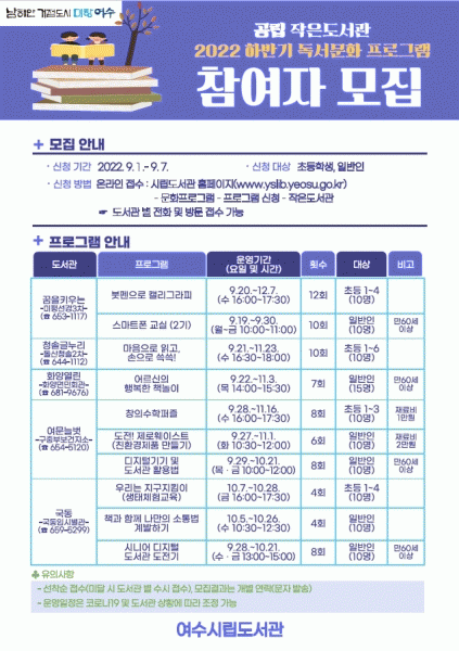 [¹Ìµð¾îÀü³² ÀüÇü¼º ±âÀÚ] ¿©¼ö½Ã°¡ ¿î¿µÇÏ´Â °ø¸³ÀÛÀºµµ¼°ü 5°³¼Ò¿¡¼ ¡®ÇϹݱ⠵¶¼¹®È ÇÁ·Î±×·¥¡¯À» ¿î¿µÇÑ´Ù. À̹ø ÇÁ·Î±×·¥Àº ÃʵîÇлý ¹× ÀÏ¹Ý ½Ã¹ÎÀ» ´ë»óÀ¸·Î Ã¥ Àбâ¿Í ¹è¿òÀÇ Áñ°Å¿òÀ» Á¦°øÇÏ´Â ÇÑÆí ÀÛÀºµµ¼°ü ÀÌ¿ë Ȱ¼ºÈ¡¦