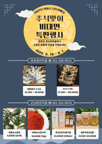 [¹Ìµð¾îÀü³² Á¦°¥´ëÁ¾ ±âÀÚ] ¿µ±¤±º Á¤º¸È¸¶À»¿¡¼´Â Ãß¼®À» ¸Â¾Æ 8¿ù 19ÀϺÎÅÍ 9¿ù 1ÀϱîÁö 2ÁÖ°£ ¡®2022³â Ãß¼®¸ÂÀÌ Á¤º¸È¸¶À» ºñ´ë¸é ƯÆÇÇà»ç¡¯¸¦ ½Ç½ÃÇÑ´Ù. À̹ø Çà»ç¿¡¼ ¿µ±¤±¼ºñ¸¶À»Àº ¿µ±¤À» ´ëÇ¥ÇÏ´Â ºê·£µåÀÌÀÚ ¸í¼ºÀÌ ³ôÀº¡¦