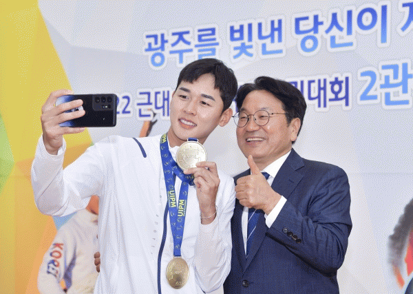 [¹Ìµð¾îÀü³² Á¦°¥´ëÁ¾ ±âÀÚ] ±¤ÁÖ±¤¿ª½Ã´Â 8ÀÏ ½Ãû 1Ãþ ½Ã¹ÎȦ¿¡¼ 2022 ±Ù´ë5Á¾ ¼¼°è¼±¼ö±Ç´ëȸ 2°ü¿ÕÀ» ´Þ¼ºÇÑ Àü¿õÅ ¼±¼öÀÇ È¯¿µ½ÄÀ» °³ÃÖÇß´Ù. ±¤ÁÖ½Ãû ±Ù´ë5Á¾ ¼±¼ö´Ü ¼Ò¼ÓÀÎ Àü¿õÅ ¼±¼ö´Â Áö³ 7¿ù23ÀϺÎÅÍ 31ÀϱîÁö ÀÌÁýÆ® ¾Ë¡¦
