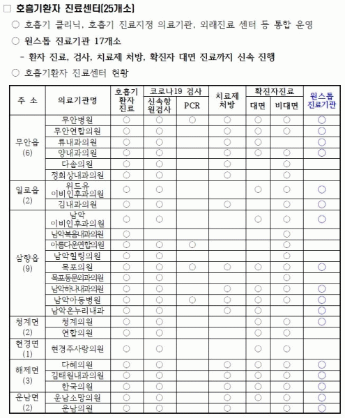 [¹Ìµð¾îÀü³² ±èÆÇ±¹ ±âÀÚ] ¹«¾È±ºÀº ÃÖ±Ù Äڷγª19 ÀçÀ¯Çà¿¡ ´ëºñÇØ È£Èí±âȯÀÚ Áø·á¼¾ÅÍ 25°÷À» È®ÃæÇϰí ÀÌ Áß¿¡¼ ¿ø½ºÅé Áø·á±â°ü 17°÷À» ÁöÁ¤Çß´Ù°í ¹àÇû´Ù. ¿ø½ºÅé Áø·á±â°üÀº Äڷγª19 ÀǽÉÁõ»óÀÌ Àְųª Áø·á°¡ ÇÊ¿äÇÑ °æ¿ì °Ë»ç¡¦