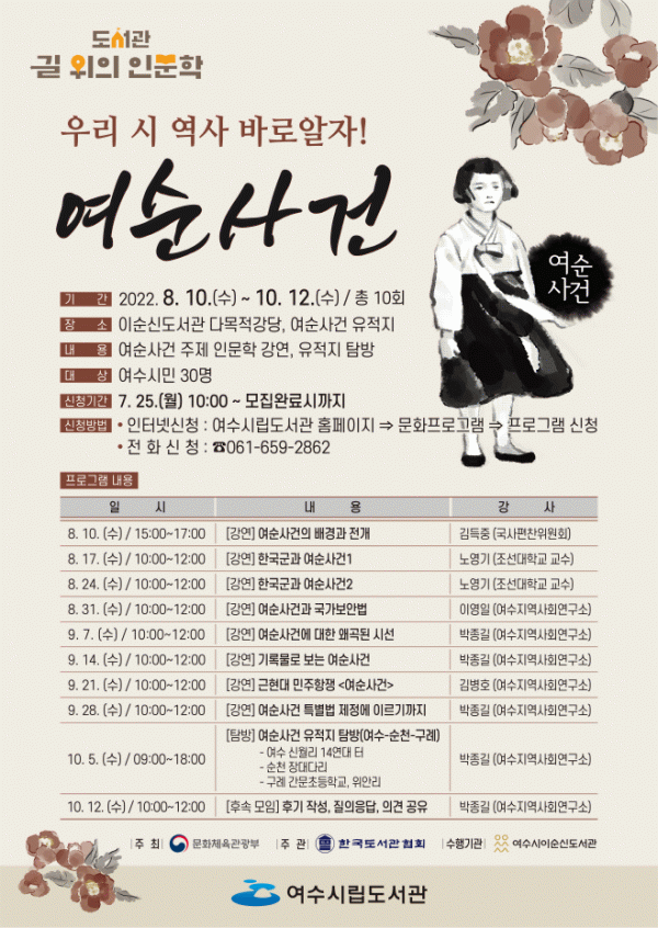 [¹Ìµð¾îÀü³² ÀüÇü¼º ±âÀÚ] ¿©¼ö½Ã¸³µµ¼°üÀÌ ¹®ÈüÀ°°ü±¤ºÎ Áö¿øÀ¸·Î Çѱ¹µµ¼°üÇùȸ°¡ ´ã´çÇÏ´Â 2022³â µµ¼°ü ¡®±æ À§ÀÇ Àι®ÇС¯ ÇÁ·Î±×·¥À» ¿î¿µÇÑ´Ù. ¡®¿ì¸®½Ã ¿ª»ç ¹Ù·Î¾ËÀÚ ¿©¼ø»ç°Ç¡¯À̶ó´Â ÁÖÁ¦·Î 8¿ù 10ÀϺÎÅÍ 10¿ù 12ÀϱîÁö¡¦