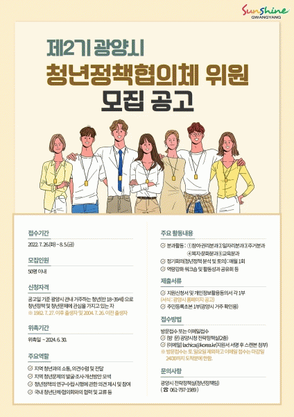 [¹Ìµð¾îÀü³² ÀÓ¼º¿Ï ±âÀÚ] ±¤¾ç½Ã´Â Áö¿ª û³âµéÀÇ ´Ù¾çÇÑ ¸ñ¼Ò¸®¸¦ µè°í Á¤Ã¥ ¹ß±¼À» ÇÔ²²ÇÒ Á¦2±â ¡®±¤¾ç½Ã û³âÁ¤Ã¥ÇùÀÇü¡¯ À§¿øÀ» ¸ðÁýÇÑ´Ù. ¸ðÁýÀοøÀº 50¸í À̳»·Î û³âÁ¤Ã¥°ú û³â¹®Á¦¿¡ °ü½ÉÀÌ ÀÖ°í ±¤¾ç½Ã¿¡ °ÅÁÖÇϴ û³âÀ̸顦