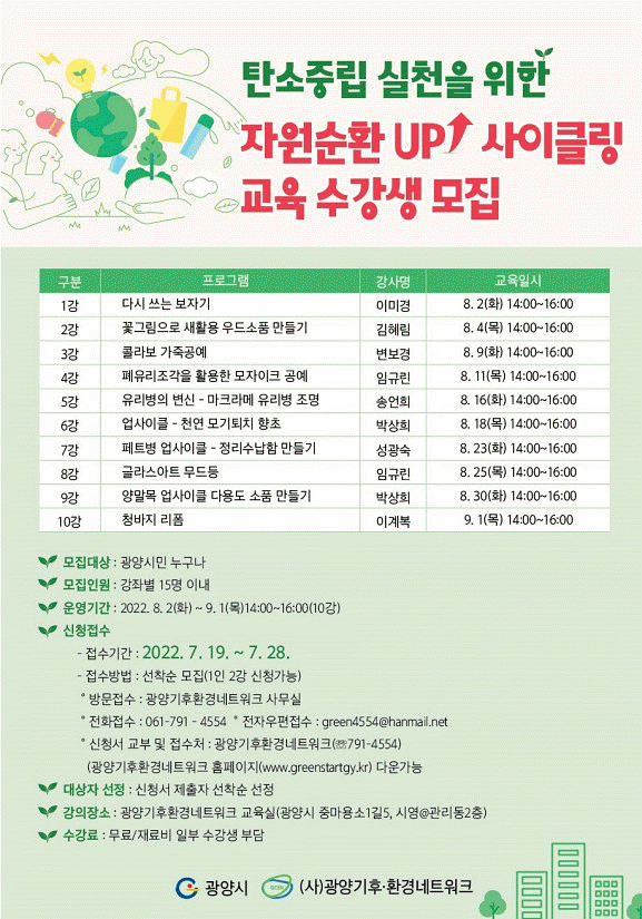 [¹Ìµð¾îÀü³² ÀÓ¼º¿Ï ±âÀÚ] ±¤¾ç½Ã¿Í Àü³²±¤¾ç±âÈÄ¡¤È¯°æ³×Æ®¿öÅ©°¡¿À´Â 28ÀϱîÁö ¡®Åº¼ÒÁ߸³ ½ÇõÀ» À§ÇÑ¡¯ÀÚ¿ø¼øÈ¯ UP »çÀÌŬ¸µ ±³À°Âü¿©ÀÚ 150¸íÀ» ¸ðÁýÇÑ´Ù. ¾÷»çÀÌŬ¸µÀº ÀçȰ¿ëǰÀ̳ª ¹ö·ÁÁö´Â ÀÚ¿ø¿¡ µðÀÚÀÎ ¶Ç´Â Ȱ¿ëµµ¸¦ ´õÇØ °¡¡¦