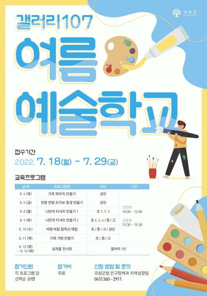 [¹Ìµð¾îÀü³² Á¦°¥´ëÁ¾ ±âÀÚ] °î¼º±º °¶·¯¸®107¿¡¼ ¿©¸§ ¹æÇÐ ±â°£ µ¿¾È Áö¿ª û¼Ò³â°ú ±º¹ÎµéÀ» À§ÇÑ ¿¹¼úÇб³¸¦ 8¿ù 4ÀϺÎÅÍ 8¿ù 11ÀϱîÁö ¿î¿µÇÑ´Ù. ¿¹¼úÇб³´Â ÃÑ 5°¡Áö °úÁ¤À¸·Î ¿î¿µµÇ¸ç Âü°¡ºñ´Â ¹«·á´Ù. Âü°¡ ÀοøÀº °¢ °úÁ¤¡¦