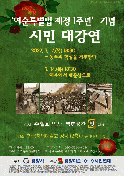 [¹Ìµð¾îÀü³² ÀÓ¼º¿Ï ±âÀÚ] ¡®¿©¼ø»ç°Ç Ưº°¹ý¡¯ Á¦Á¤ 1ÁÖ³âÀ» ¸Â¾Æ ±¤¾ç½Ã°¡ ÁÖÃÖÇÏ°í ±¤¾ç¿©¼ø10¡¤19½Ã¹Î¿¬´ë°¡ ÁÖ°üÇÏ´Â ¡®¿©¼ø»ç°Ç ½Ã¹Î ´ë°¿¬¡¯ÀÌ 7¿ù 14ÀÏ ¿ÀÈÄ 6½Ã 30ºÐ¿¡ Çѱ¹Ã¢ÀÇ¿¹¼ú°í 2Ãþ °´ç¿¡¼ °³ÃֵȴÙ. °ÀÇ´Â ÁÖöÈñ¡¦