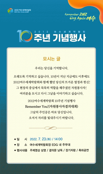 [¹Ìµð¾îÀü³² ÀüÇü¼º ±âÀÚ] ¿©¼ö½Ã°¡ 7¿ù 23ÀÏ Åä¿äÀÏ ¿ÀÈÄ 2½Ã ¿©¼ö¼¼°è¹Ú¶÷ȸÀå ÁÖ¹«´ë¿¡¼ ÀÚ¿øºÀ»çÀÚ¿Í ÇÔ²²ÇÏ´Â ¹Ú¶÷ȸ 10Áֳ⠱â³äÇà»ç ¡®¸®¸â¹ö À¯¡¯¸¦ °³ÃÖÇÑ´Ù. 2012¿©¼ö¼¼°è¹Ú¶÷ȸ ¼º°ø°³ÃÖ¸¦ À§ÇØ Çå½ÅÇÑ ÀÚ¿øºÀ»çÀÚ 2,012¸íÀ»¡¦