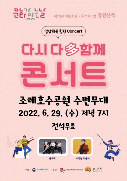 [¹Ìµð¾îÀü³² ÀÓ¼º¿Ï ±âÀÚ] ¼øÃµ½Ã´Â ¿À´Â 29ÀÏ ¿ÀÈÄ 7½ÃºÎÅÍ Á¶·ÊÈ£¼ö°ø¿ø ¼öº¯¹«´ë¿¡¼ ¹®È°¡ ÀÖ´Â ³¯ °ø¿¬»êÃ¥ ¡®´Ù½Ã ´ÙÇÔ²² ÄܼƮ¡¯¸¦ °³ÃÖÇÑ´Ù. ½Ã´Â À۳⿡ À̾î 2³â ¿¬¼Ó Çѱ¹¹®È¿¹¼úȸ°ü¿¬ÇÕȸ °ø¸ð »ç¾÷¿¡ ¼±Á¤µÇ¾î ¸Å¿ù ¸¶¡¦