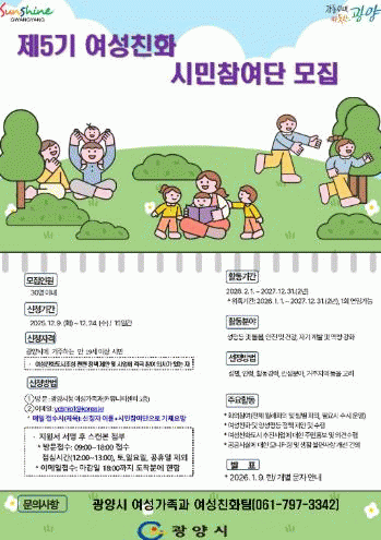 [¹Ìµð¾îÀü³² ÀÓ¼º¿Ï ±âÀÚ]±¤¾ç½Ã´Â ¿©¼ºÄ£Èµµ½Ã Á¶¼º¿¡ ½Ã¹ÎÀÇ ¸ñ¼Ò¸®¸¦ Àû±Ø ¹Ý¿µÇϱâ À§ÇØ Á¦5±â ¿©¼º Ä£È ½Ã¹ÎÂü¿©´ÜÀ» ¸ðÁýÇÑ´Ù°í ¹àÇû´Ù. À̹ø ¸ðÁýÀº Á¦4±â ½Ã¹ÎÂü¿©´ÜÀÇ Àӱ⠸¸·á¿¡ µû¸¥ °ÍÀ¸·Î, ½Ã¹ÎÀÌ Á÷Á¢ Á¤Ã¥ Á¦¾È°ú ¸ð´Ï¡¦