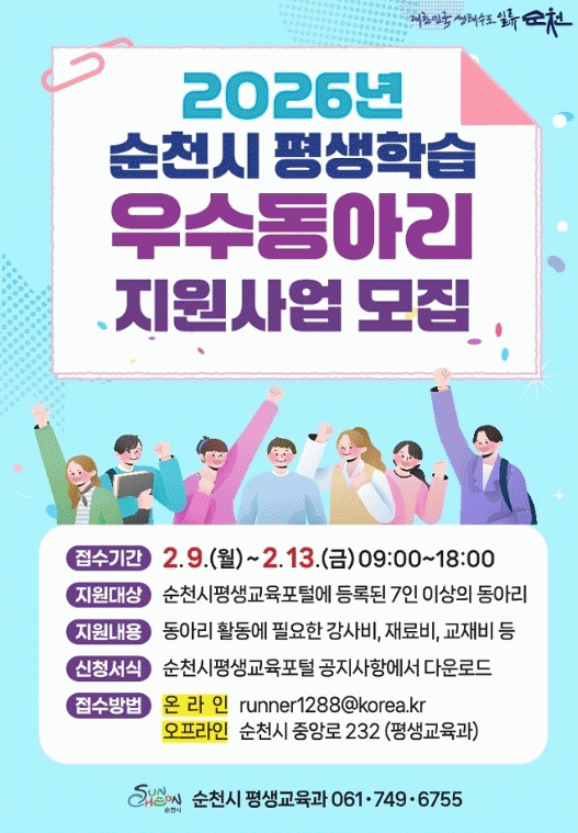 [¹Ìµð¾îÀü³² ÀÓ¼º¿Ï ±âÀÚ]¼øÃµ½Ã°¡ Áö¿ª»çȸ Æò»ýÇнÀ ¹®È È®»êÀ» À§ÇØ ¿À´Â 9ÀϺÎÅÍ 13ÀϱîÁö ¡®2026³â Æò»ýÇнÀ ¿ì¼öµ¿¾Æ¸® Áö¿ø»ç¾÷¡¯¿¡ Âü¿©ÇÒ µ¿¾Æ¸®¸¦ ¸ðÁýÇÑ´Ù°í ¹àÇû´Ù. ½Åû ´ë»óÀº °ø°íÀÏ ±âÁØ ¼øÃµ½Ã Æò»ý±³À° Æ÷Åп¡ µî·Ï¡¦