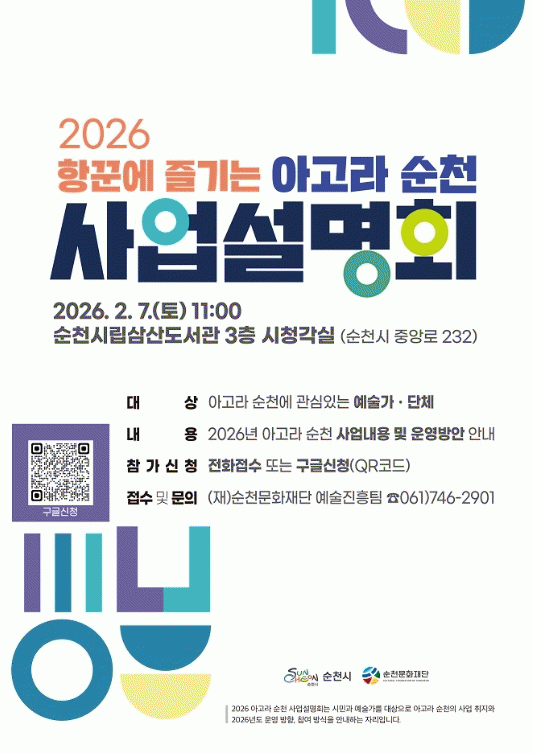 [¹Ìµð¾îÀü³² ÀÓ¼º¿Ï ±âÀÚ](Àç)¼øÃµ¹®ÈÀç´ÜÀº ¿À´Â 7ÀÏ 11½Ã, ¼øÃµ»ï»ê½Ã¸³µµ¼°ü ½Ãû°¢½Ç¿¡¼ Áö¿ª¿¹¼úÀΰú ½Ã¹ÎÀ» ´ë»óÀ¸·Î ¡®2026 Çײۿ¡ Áñ±â´Â ¾Æ°í¶ó ¼øÃµ¡¯ »ç¾÷¼³¸íȸ¸¦ °³ÃÖÇÑ´Ù. ¿ÃÇØ·Î 14³â°¸¦ ¸ÂÀº ¾Æ°í¶ó ¼øÃµÀº ±×µ¿¾È ¡¦