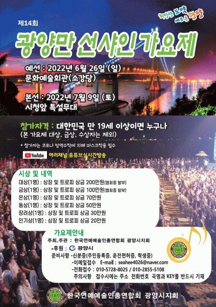 [¹Ìµð¾îÀü³² ÀÓ¼º¿Ï ±âÀÚ] Çѱ¹¿¬¿¹¿¹¼úÀÎÃÑ¿¬ÇÕȸ ±¤¾ç½ÃÁöȸ°¡ ÁÖ°üÇÏ´Â ¡®Á¦14ȸ ±¤¾ç¸¸ ¼±»þÀÎ °¡¿äÁ¦¡¯°¡ ¿À´Â 7¿ù 9ÀÏ Åä¿äÀÏ ¿ÀÈÄ 6½Ã ±¤¾ç½Ãû ¾Õ ¾ß¿Ü°ø¿¬Àå¿¡¼ °³ÃֵȴÙ. ¿¹¼±Àº ¿À´Â 26ÀÏ ¿ÀÈÄ 1½ÃºÎÅÍ ±¤¾ç¹®È¿¹¼úȸ°ü ¼Ò¡¦