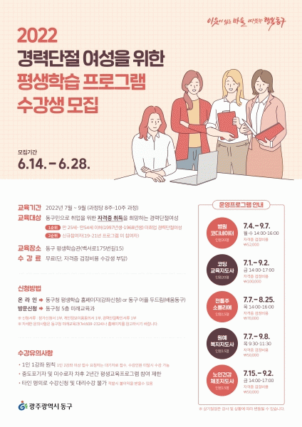 [¹Ìµð¾îÀü³² ±èÁ¤¿ì ±âÀÚ] ±¤ÁÖ µ¿±¸´Â °æ·Â´ÜÀý ¿©¼ºÀ» À§ÇÑ Æò»ýÇнÀ ÇÁ·Î±×·¥ ¼ö°»ýÀ» ¸ðÁýÇÏ°í ¿À´Â 7¿ùºÎÅÍ ¿î¿µ¿¡ µé¾î°£´Ù°í ¹àÇû´Ù. À̹ø ÇÁ·Î±×·¥Àº Áö³ 2019³âºÎÅÍ Áö¼Ó ¿î¿µ ÁßÀÎ »ç¾÷À¸·Î Áö³ÇØ´Â 73¸íÀÌ ÀÚ°ÝÁõÀ» ÃëµæÇÏ¡¦