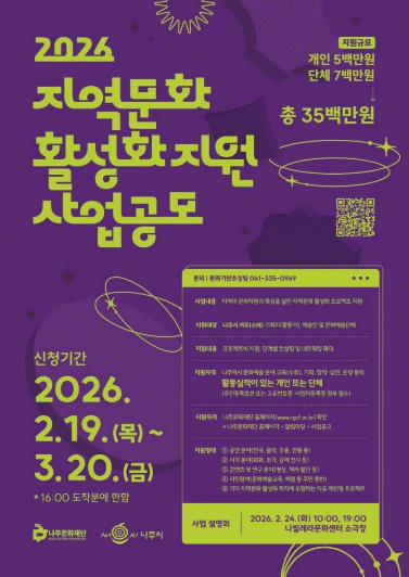 [¹Ìµð¾îÀü³² Á¦°¥´ëÁ¾ ±âÀÚ]³ªÁÖ¹®ÈÀç´ÜÀÌ Áö¿ªÀ» ±â¹ÝÀ¸·Î Ȱµ¿ÇÏ´Â ¿¹¼úÀΰú ¹®È±âȹÀÚÀÇ Ã¢ÀÇÀûÀÎ ÇÁ·ÎÁ§Æ®¸¦ Áö¿øÇϸç Áö¼Ó °¡´ÉÇÑ Áö¿ª¹®È »ýŰè Á¶¼º¿¡ ³ª¼±´Ù. ³ªÁÖ¹®ÈÀç´ÜÀº ¡®2026 Áö¿ª¹®È Ȱ¼ºÈ Áö¿ø»ç¾÷¡¯ °ø¸ð¸¦ ¿À´Â¡¦