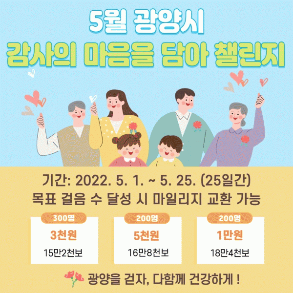 [¹Ìµð¾îÀü³² ÀÓ¼º¿Ï ±âÀÚ] ±¤¾ç½Ã°¡ °È±â¸¦ ÅëÇØ °Ç°ÇÑ Áö¿ª»çȸ ºÐÀ§±â¸¦ Á¶¼ºÇϰíÀÚ ÀÏ»ó ¼Ó °Ç°°È±â½Çõ ¸ð¹ÙÀÏ °È±â¾Û ¿öÅ©¿Â ¡®5¿ù °¨»çÀÇ ¸¶À½À» ´ã¾Æ, °È±â 縰Áö¡¯¸¦ ¿î¿µÇÑ´Ù. 5¿ù 1~25ÀÏ ÁøÇàµÇ´Â °È±â 縰Áö´Â 1°ÉÀ½´ç ¡¦