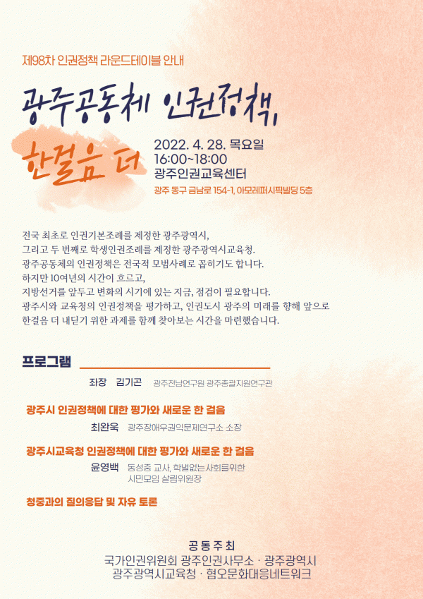 [¹Ìµð¾îÀü³² Á¦°¥´ëÁ¾ ±âÀÚ] Áö¿ª¿¡¼ÀÇ ÀαÇÁ¦µµÈ¸¦ ¼±µµÇϰí ÀÖ´Â ±¤ÁÖ°øµ¿Ã¼ÀÇ ÀαÇÁ¤Ã¥À» Á¡°ËÇÏ´Â ÀÚ¸®°¡ ¿¸°´Ù. ±¤Áֽñ³À°Ã»ÀÌ ¿À´Â 28ÀÏ ¿ÀÈÄ 4½Ã ¡®±¤ÁÖ°øµ¿Ã¼ ÀαÇÁ¤Ã¥, ÇÑ °ÉÀ½ ´õ¡¯¶ó´Â ÁÖÁ¦·Î Á¦98Â÷ ÀαÇÁ¤Ã¥¶ó¿îµåÅ×ÀÌ¡¦
