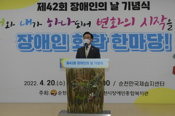 [¹Ìµð¾îÀü³² ÀÓ¼º¿Ï ±âÀÚ] ¼øÃµ½Ã´Â 20ÀÏ Àå¾ÖÀÎÀÇ ³¯À» ¸Â¾Æ ¼øÃµ¸¸±¹Á¦½ÀÁö¼¾ÅÍ¿¡¼ ¡®³Ê¿Í ³»°¡ ÇϳªµÇ¾î º¯ÈÀÇ ½ÃÀÛÀ» ¾Ë¸®´Â Àå¾ÖÀÎ ÈÇÕ ÇѸ¶´ç¡¯À̶ó´Â ½½·Î°ÇÀ¸·Î Á¦42ȸ Àå¾ÖÀÎÀÇ ³¯ ±â³ä½ÄÀ» °³ÃÖÇß´Ù. À̳¯ Çà»ç´Â ¼øÃµ½Ã À塦