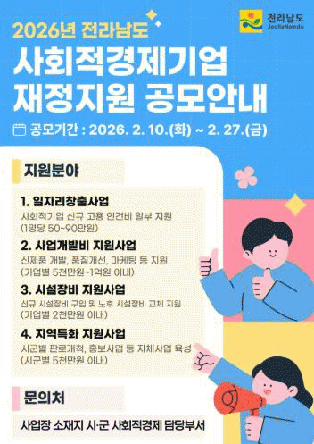 [¹Ìµð¾îÀü³² Á¦°¥´ëÁ¾ ±âÀÚ]Àü¶ó³²µµ´Â ¿À´Â 27ÀϱîÁö »çȸÀû°æÁ¦±â¾÷ÀÇ Áö¼ÓÀûÀÌ°í ¾ÈÁ¤ÀûÀÎ ¼ºÀå°ú ÀÚ¸³À» Áö¿øÇϱâ À§ÇÑ 2026³â »çȸÀû°æÁ¦±â¾÷ ÀçÁ¤Áö¿ø»ç¾÷ °ø¸ð¸¦ ÃßÁøÇÑ´Ù. À̹ø °ø¸ð´Â ¡ãÀÏÀÚ¸®Ã¢Ãâ Áö¿ø ¡ã»ç¾÷°³¹ßºñ Áö¿ø ¡ã½Ã¡¦
