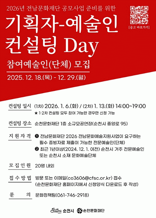 [¹Ìµð¾îÀü³² ÀÓ¼º¿Ï ±âÀÚ](Àç)¼øÃµ¹®ÈÀç´ÜÀº ¿À´Â 29ÀϱîÁö ¡®2026 ±âȹÀÚ-¿¹¼úÀÎ ÄÁ¼³ÆÃ Day(ÀÌÇÏ ÄÁ¼³ÆÃ Day)¡¯¿¡ Âü¿©ÇÒ Àü¹®¿¹¼úÀÎ(´Üü)À» °ø°³ ¸ðÁýÇÑ´Ù. ¡®ÄÁ¼³ÆÃ Day¡¯´Â Áö³ 6³â°£ ¿î¿µÇØ ¿Â ¡®Áö¿ª¿¹¼úÀΡ¤±âȹÀÚ ¸ÅĪ Áö¿ø¡¦